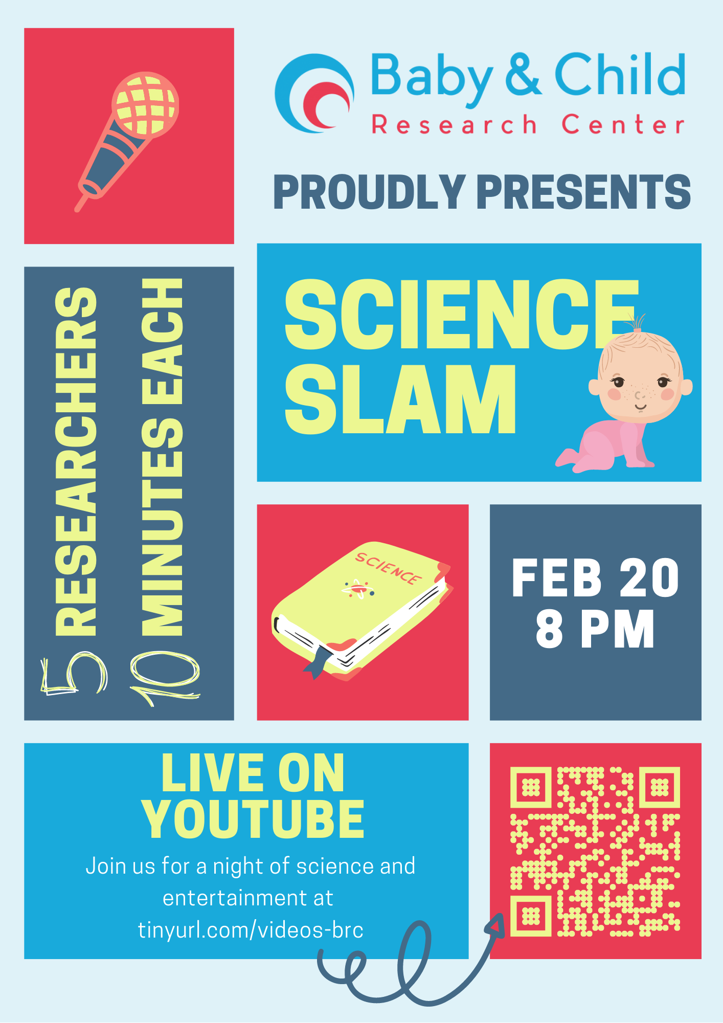 The Baby & Child Research Center proudly announces the first BRC Science Slam. Join us on Saturday, February 20, at 8 pm for a night of science and entertainment. Five early career researchers get 10 minutes each to present their research in a fun and entertaining way. How do children develop interpersonal coordination? What’s the role of interaction in early word learning? How does contact-based intervention work? Tune in to find out! The event will be live streamed on our YouTube channel.