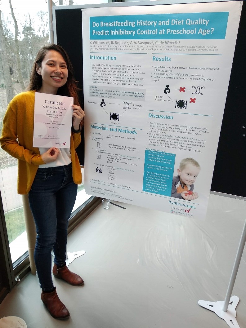Yvonne presented her research on the relation between breastfeeding, diet quality, and toddlers’ inhibitory control (the suppression of impulses). Questionnaires had been administered and behavioral tasks performed to measure toddlers’ inhibitory control. Whether the mother was breastfeeding was regularly assessed after birth. Furthermore, food questionnaires were used to chart what the toddler generally consumed in a week. For both breastfeeding duration and diet quality, no association was found with toddlers’ inhibitory control. This study contributes to the growing literature on breastfeeding, diet, and inhibition in young children.