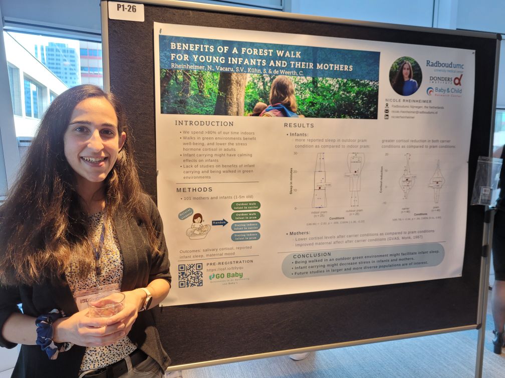 Our own DPB research was shared via poster sessions. Nina Bruinhof presented two projects, one on mother-infant stress contagion, which looked at the effects of a maternal stressor on caregiving behavior and infant response. Her other project was about moment-to-moment relations between maternal milk cortisol and infant behavior. From the same SMILEY cohort, Hellen presented the findings from a laboratory experiment that examined stress-related eating in pregnancy. Nicole shared her findings of the GO Baby study about the benefits of infant carrying and walking with the infant in a green environment. Lastly, Stefania Vacaru’s recent findings comparing hair cortisol levels between the BIBO cohort and a similar USA cohort were presented by Anna Parenteau, from the Social Environment and Stress (SES) Lab.